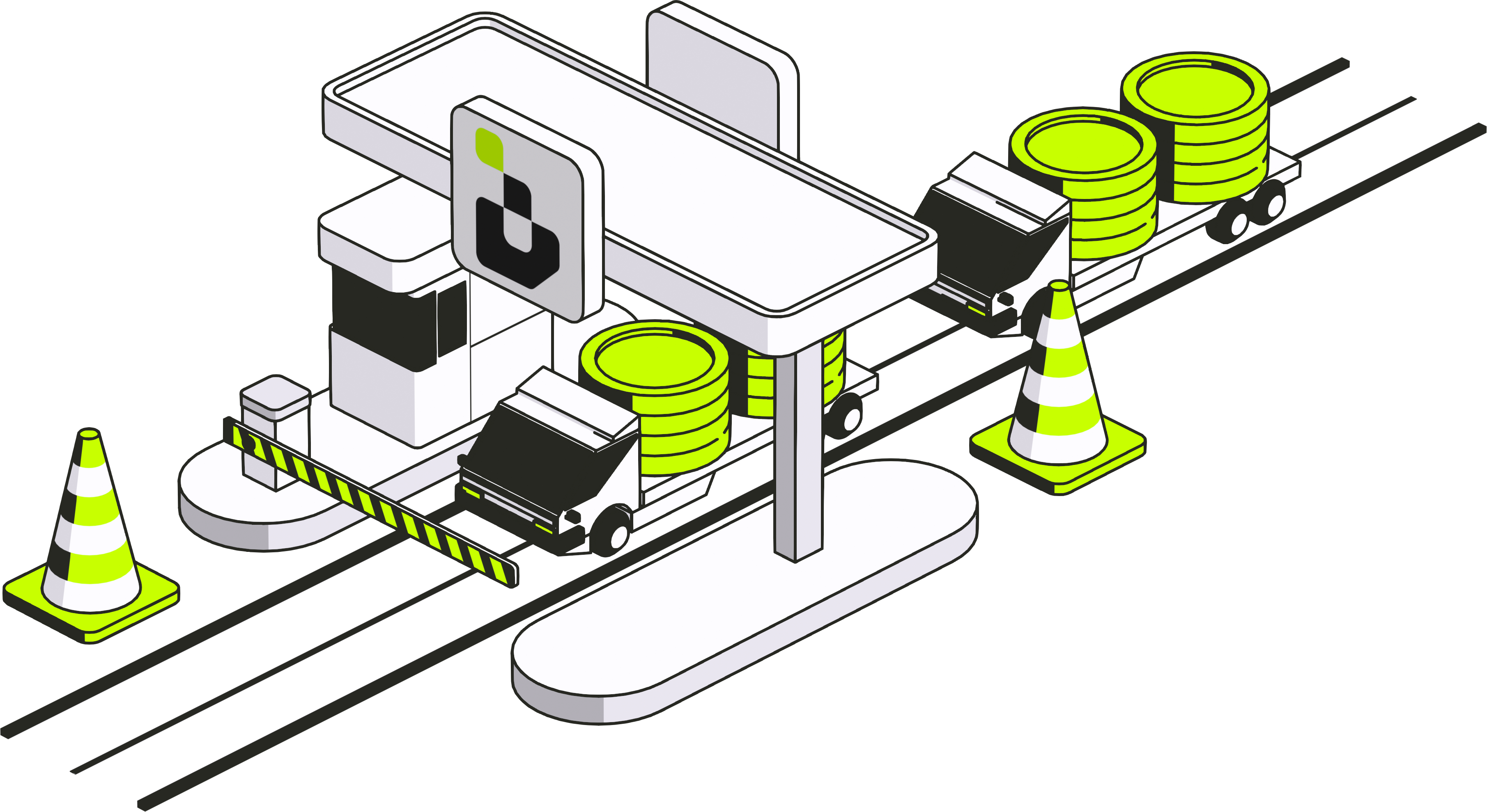 Illustration of a compliance checkpoint: trucks carrying stablecoin stacks pass through a verification gate under the Interstice mark