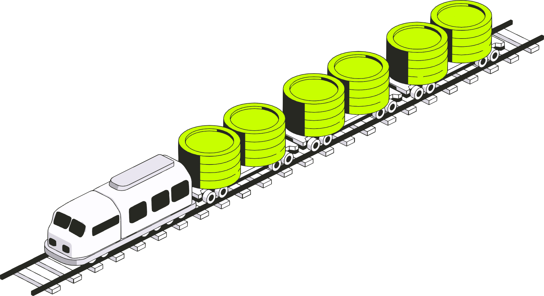 Illustration of a train carrying stacks of coins along a payment rail