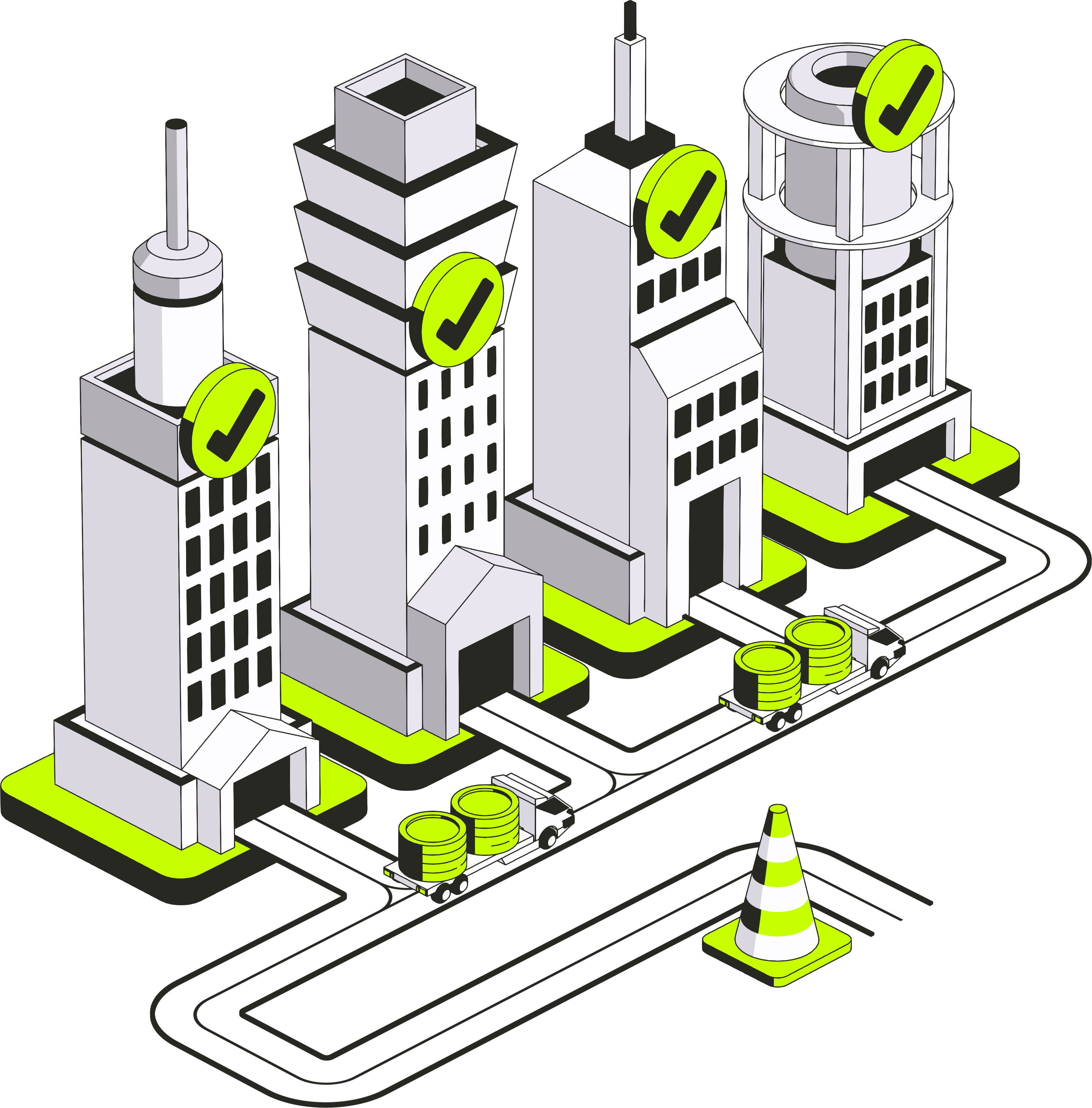 Isometric illustration of a city district of verified, compliance-approved buildings with trucks carrying stablecoin stacks along the connecting roads
